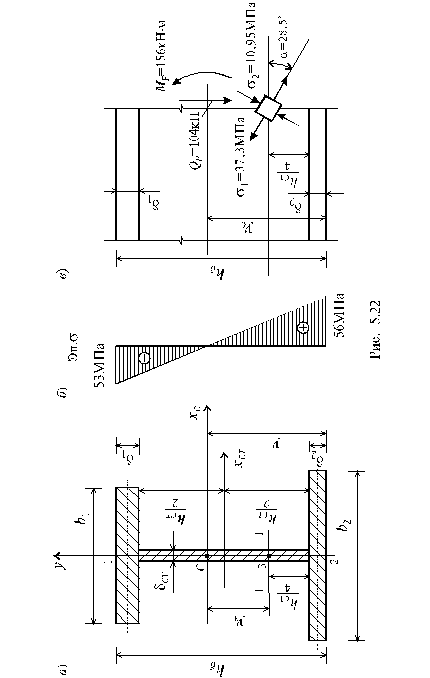 Определение центра тяжести поперечного сечения балки. Ось y является осью симметрии сечения балки, следовательно, центр его тяжести находится на этой оси. За вспомогательную ось для определения координаты центра тяжести сечения на оси y принимаем ось x 1 (рис. 5.22, а). Заметим, что поперечное сечение балки является составным, и включает в себя три прямоугольника (верхняя и нижняя полки, а также стенка). С учетом данного обстоятельства и воспользовавшись выражением (3.6), вычислим статический момент площади поперечного сечения балки относительно оси x 1 :