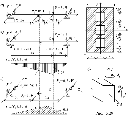 Стальная балка АВ, расчетная схема и поперечное сечение которой показаны на рис. 5.28, а, (c = 0,03 м) нагружена силами Р 1 и Р 2. Требуется: