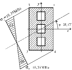 3. Вычислить наибольшие растягивающие и сжимающие нормальные напряжения. Вершины стрелок нормальных напряжений, определяемых по формуле (5.26) будут лежать на плоскости, пересекающей плоскость поперечного сечения по нулевой линии. При взгляде на плоскость напряжений вдоль нулевой линии мы увидим ее в виде прямой, ординаты которой показаны в виде эпюры s на рис. 5.29. Наибольшие нормальные напряжения будут иметь место в точках 2 и 4 и различаться только знаком. Действительно, подставляя в формулу (5.26) координаты точек 2 и 4, получаем: