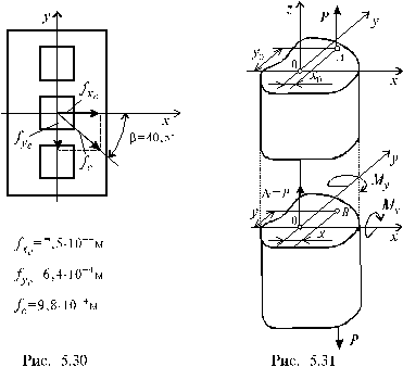 Нулевая линия пройдет в тех четвертях поперечного сечения, в которых изгибающие моменты будут вызывать нормальные напряжения разных знаков. В нашем случае это будут первая и третья четверти. Поэтому, отложив угол j»»28,17° от оси x против хода часовой стрелки, проведем нулевую линию (рис. 5.29).