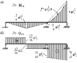 ql 2 (рис. 6.15, а). Эпюру QОК для заданной системы можно построить следующим образом. Заменив в заданной системе опорные реакции RA на X 1, получим статически определимую эквивалентную систему, тождественную заданной. Далее, определяя остальные опорные реакции RC и RD и по методу сечений составляя аналитические выражения изменения поперечных сил на каждом участке, по ним определив ординаты в характерных сечениях, строится эпюра QОК (рис. 6.15, б).