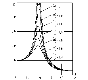График b в зависимости от отношения частот и параметра затухания n приведен на рис. 8.3. Откуда следует, что при w ® j Р 0×d11×b, т.е. амплитуда вынужденных колебаний резко возрастает, а при n ® 0, w ® j, получаем Р 0×d11×b ® ¥. Это явление носит название резонанса. При n = 0 выражение для b упрощается и принимает вид:
