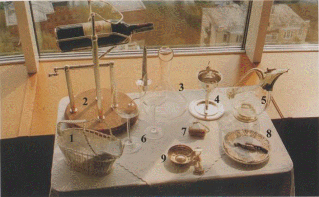 Для декантации используют декантировочную подставку (пушку), штатив-модерн или корзинку, декантер, то есть графин для переливания вина, воронку (с фильтром или аэратором), свечу в подсвечнике, спички или зажигалку, нож сомелье, дегустационный бокал или чашу, цепочку-держателя винной пробки (рис. XXI).