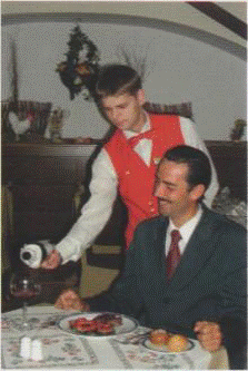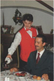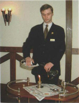 Бутылку белого вина сомелье охватывает с обеих сторон ручником и наливает заказчику пробный глоток вина, затем разливает его гостям и доливает заказчику (рис. XXIII а).