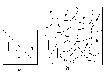 Известно, что даже в монокристаллах, а тем более в поликристаллических материалах весь объем тела разделен на области - домены, разделенные узкими границами, носящими название стенок доменов. Размеры доменов различны для разных веществ, и даже в одном материале они зависят от структуры и свойств определенного образца. Как правило, размеры доменов составляют 10-3…10-2 см, а толщина стенок между доменами - порядка 10…100 нм. Каждый из доменов ориентирован в присущем ему направлении легкого намагничивания (рис. 19).