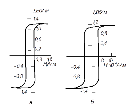Рис. 20. Петли магнитного гистерезиса для магнитно-мягких материалов (а) и магнитно-твердых материалов (б). Обратите внимание на масштаб по оси абцисс