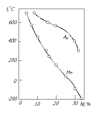 Рис. 22. Зависимость положения точек прямого Мн и обратного Ан мартенситного превращения от концентрации никеля в сплавах Fe – Ni