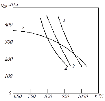 Рис. 36. Температурная зависимость длительной прочности sв за 1000 ч направленно-кристаллизованной эвтектики Ni3Al + 40 % Ni3Nb (1) по сравнению с жаропрочными стареющими сплавами Co + 15 % Cr + 13 % TaC (2), Rene 120 (3), Rene 80 (4)