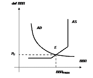 Кейнсианский вариант модели AD – AS можно графически интерпретировать на кейнсианском участке кривой совокупного предложения. Совокупный объем планируемых расходов покупателей равен стоимости произведенных в стране товаров и услуг. Данное равенство может быть представлено формулой:
