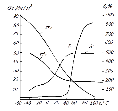 - мягкий и гибкий материал. При нагревании прочностные свойства его снижаются; с понижением температуры возрастает твердость, однако даже при низких температурах он не становится хрупким (см. рис. 43).