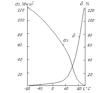 Рис. 54. Влияние температуры на механические свойства полиметилметакрилата