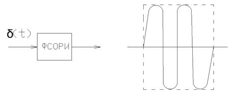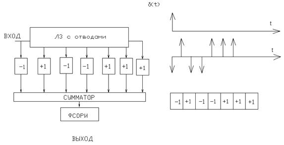 Как видим, импульсная характеристика синтезированного оптимального фильтра представляет собой тоже ФКМ-импулсьс, код которого является зеркальным отображением кода сигнала, следовательно реакцией нашего фильтра на δ-импульс будет n примыкающих друг к другу прямоугольных радиоимпульсов одинаковой длительностью, амплитудой и частотой.