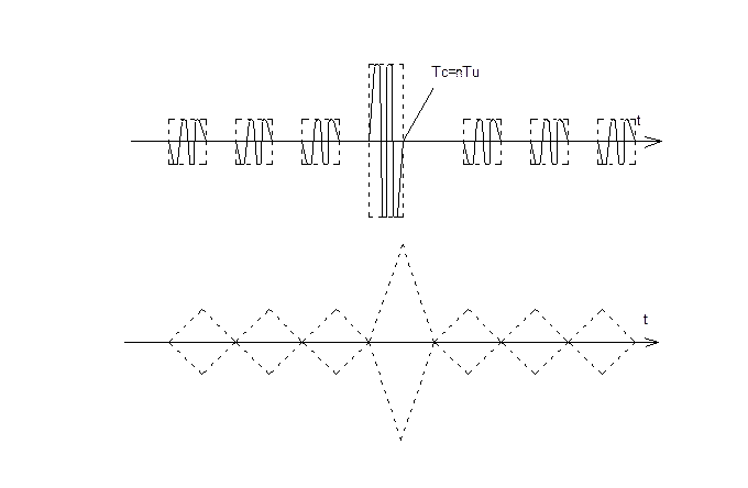 Как видим, один ФКМ-импульс превратился в семь треугольных импульсов: в один центральный и шесть боковых.