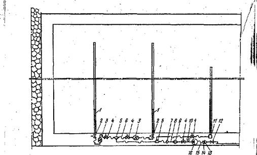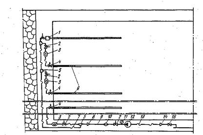 Рис. 2.1 Технологическая схема высоконапорного нагнетания жидкости в пласт через скважины, пробуренные из подготовительной выработки: 1 — гидрозатворы; 2 — разгрузочные вентили; 3 — счетчики-расходомеры; 4 —- регулируемые проходные вентили; 5 — тройники; 6 — рукав высокого давления; 7 — переходник; 8 — трубопровод; 9 — дозатор смачивателя; 10 — манометр; 11 — буровая установка; 12 — фланцевый вентиль; 13 — переходник; 14 — штрековый фильтр; 15 — напорный рукав; 16 — высоконапорный насос