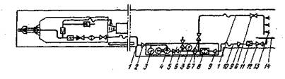 Рис. 3.3. Технологическая схема орошения при работе проходческих комбайнов: 1,10 — рукава; 2,9 — переходники; 3 — манометры; 4 — насосная установка; 5 — вентиль с электромагнитным управлением; б —муфтовые краны; 7— дозатор смачивателя; 8 — штрековый фильтр; // — редукционный штрековый клапан; 12 — фланцевый вентиль; 13 — водяная завеса; 14 — противопожарно-оросительный трубопровод