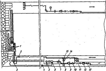 Рис. 3.4. Технологическая схема орошения при работе выемочного комбайна: I — забойные водопроводы; 2 — зонтичная форсунка; 3 — проходной муфтовый кран; 4, 10 — переходники; 5,8 — манометры; 6 — насосная установка; 7 — вентиль с электромагнитным управлением; 9 — штрековый фильтр; 11 — напорный рукав; 12 ~ редукционный клапан; 13 — фланцевый вентиль; 14 — дозатор смачивателя; 15 — трехходовой муфтовый кран