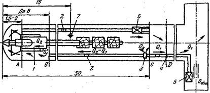 Локализация источников пылеобразования у забоя достагается путем рассредоточенного нагнетания свежего воздуха (рис. 3.5). При этом при-забойное пространство проветривается свободной турбулентной струей, а остальная часть воздуха через специальные регулируемые отверстия в подающем воздухопроводе выпускается на расстоянии 15—25 м от забоя. При этом подача воздуха Q в призабойное пространство рассчитывается исходя из условий создания взрывобезопасной концентрации метана на участке выработки от забоя до сечения В — В.