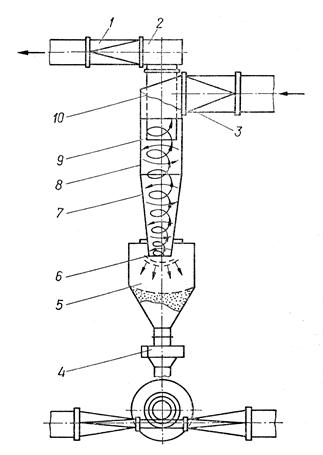 | Рис. 5.8. Цилиндрический (а) и конический (б) циклоны | Рис.5.9. Схема циклона НИИОГаз: 1 - газоход очищенных газов; 2 - улитка для вывода газов; 3 - входной патрубок; 4 - пылевой затвор; 5 - бункер; 6 - пылевыпускное отверстие; 7 – корпус (коническая часть); 8 – корпус (цилиндрическая часть); 9 - выхлопная труба; 10 - винтообразная крышка. |