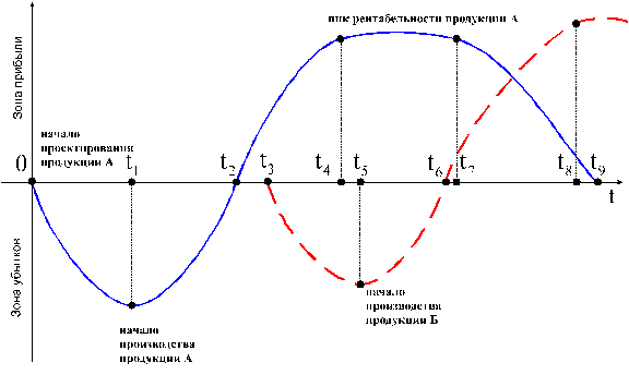 Для сохранения уровня прибыли на предприятии важно определить момент начала проектирования и запуска в производство новой продукции. Дело в том, что этап проектирования и освоения продукции занимает определенное время, в течение которого предприятие несет убытки (0; t1). Затем с момента запуска продукции в производство (t1) убытки начинают снижаться и через некоторое время достигается точка безубыточности (t2). При увеличении объема продаж растет и прибыль за счет снижения доли постоянных расходов (t2; t4). При достижении равновесия спроса и предложения размер прибыли стабилизируется и некоторое время остается на неизменном уровне (t4;t7). Такое положение может сохраняться довольно длительное время при отсутствии угрозы со стороны конкурентов и при стабильном спросе на продукцию. При наличии конкурентов поддержание уровня продаж достигается путем снижения рентабельности, то есть, понижения цены за счет доли прибыли. Эффективность начинает снижаться (t7; t9).