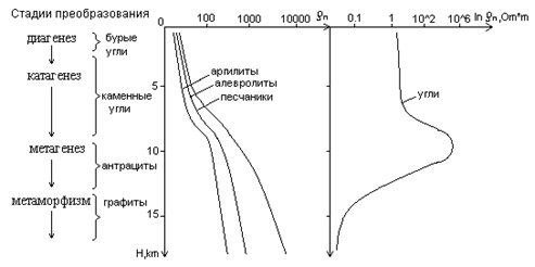 Для одноименных по вещественно-петрографическому составу пород тенденция изменения электрических параметров в зависимости от стадии преобразования следующая (рис. 2.5).