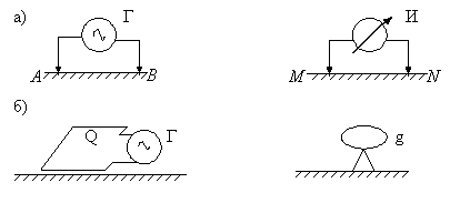 Рис. 2.6. Схемы гальванического (а) и индуктивного (б) возбуждения и приема сигналов электромагнитного поля