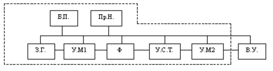 З.Г. – задающий генератор, У.М. – усилитель мощности, Ф – фильтр, У.С.Т. – устройство стабилизации тока, В.У. – выходное устройство, Б.П. – блок питания, Пр.Н. – преобразователь напряжения.