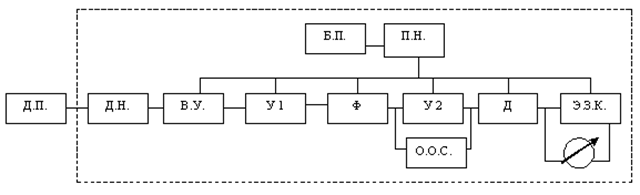 Д.П. – датчик поля, ДН. – делитель напряжения, В.У. – входное устройство (обеспечение высокоомного входа), У – усилитель, Ф – фильтр (фильтрация всевозможных помех), Д – детектор (выпрямление сигнала), Э.З.К. – электрозаписная книга, О.О.С. – отрицательная обратная связь (многократное усиление), Б.П. – блок питания, П.Н. – преобразователь напряжения