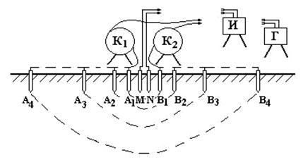 Технология выполнения ВЭЗ описана в многочисленных учебниках, справочниках и руководствах. Она сводится к устройству на поверхности земли электроразведочной установки, состоящей из двух питающих А и В и двух измерительных (приемных) М и N электродов, расположенных симметрично относительно центра (рис. 2.20). Через электроды А и В от батареи или генератора в землю поступает электрический ток силой I, а между приемными электродами М и N измеряют разность потенциалов ΔU. Сделав первый замер, увеличивают разнос АВ и вновь измеряют силу тока I и разность потенциалов ΔU.