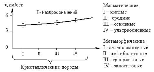 Скорость распространения упругих волн в кристаллических породах увеличивается у магматических в щелочноземельном ряду от кислых к ультраосновным и у метаморфических по мере роста степени метаморфизма. Для обоих групп графики изменения однотипны (рис. 2.41).