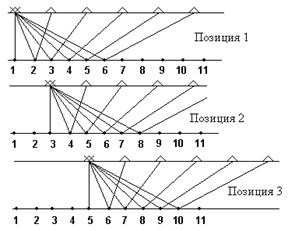 Рис. 2.44. Схемы размещения ПВ и ПП в методе ОГТ