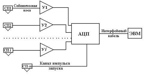 Совокупность усилительных каскадов и регистрирующих устройств составляют сейсморазведочную станцию (рис. 2.48). Электрические сигналы от сейсмоприемников поступают на входы сейсмических усилителей и далее через коммутирующее устройство на аналогово-цифровой преобразователь (АЦП). Кодирование сигналов начинается лишь с момента поступления сигнала синхронизации с усилителя-формирователя импульса запуска, на вход которого подключается сейсмоприемник, устанавливаемый на землю рядом с пунктом возбуждения.
