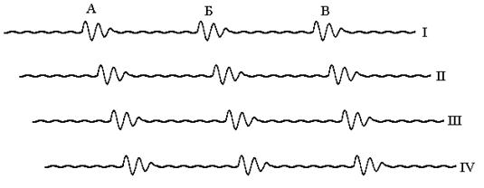 Сейсмическая интерпретация состоит из визуального воспроизведения записей (на бумажном носителе или на экране дисплея) с их последующим нормированием (выравниванием) и фильтрацией в различных частотных диапазонах по сейсмотрассе. Основная задача сейсмической интерпретации - выделить однократные волны, которые несут полезную информацию на фоне многократных волн-помех. Далее производится сопоставление отфильтрованных сейсмотрасс, то есть их корреляция (рис. 2.50). При этом следует отметить, что в процессе фильтрации однократных волн от маркирующих горизонтов уверено выделяются лишь в тех случаях, когда толщина слоев сопоставима с длиной волны. В противном же случае фиксируются отражения от неких промежуточных горизонтов, так как тонкие слои являются «прозрачными».