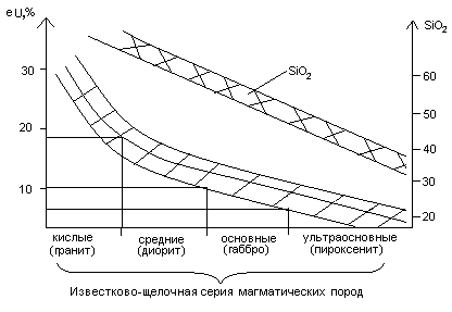 Радиоактивность интрузивных и эффузивных пород известково-щелочной серии возрастает от ультраосновных пород к основным, средним и далее к кислым пропорционально увеличению содержания в них кремнезема и калия (рис. 3.5).