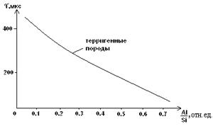Чистые кварцевые песчаники и доломиты характеризуются наибольшими значениями τ. Ангидриты, гипсы и глинистые породы имеют минимальные значения τ. Уменьшает τ бор, а также K, Mn, Na, Fe и другие элементы. В качестве примера на рис. 3.13 показана зависимость изменения τ от алюминиево-кремнистого модуля (Al/Si).
