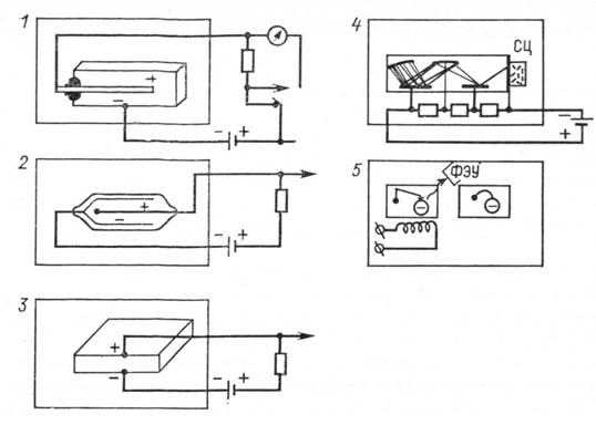 1 — ионизационная камера; 2 — счетчик Гейгера — Мюллера; 3 — полупроводниковый кристалл; 4 — шинтилляционный счетчик; 5 — термолюминесцентный кристалл; СЦ— сцинтиллятор; ФЭУ — фотоэлектронный умножитель