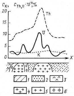 В результате наземной гамма-съемки строят графики, карты графиков и карты интенсивности ∆Jγ эквивалентные гамма-активности пород ∆Jγ = Jу - J нф (интегральной или спектральным). Обработка данных спектрометрической гамма-съемки сводится к вычислению концентраций (С) урана, тория и калия (К40) по Jγ на разных энергиях. На рисунке 3.16 приведен пример результатов спектрометрической гамма-съемки в Восточной Сибири, в результате которой удалось выявить в гранитах танталониобиевую минерализацию.