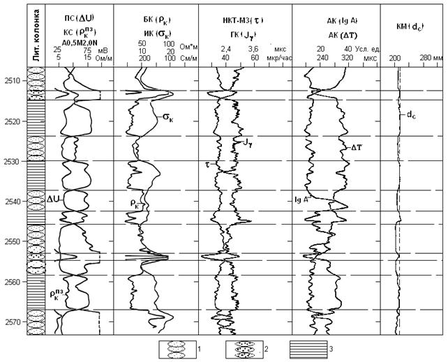 Сопоставление кривых показывает, что исследованный разрез наиболее уверенно дифференцируется по кривым КС, ПС и КМ. На диаграммах ГК, НКТ и АК однозначно выделяются только плотные высокоомные пласты, вскрытые в интервалах 2515-2518м и 2552-2555м.