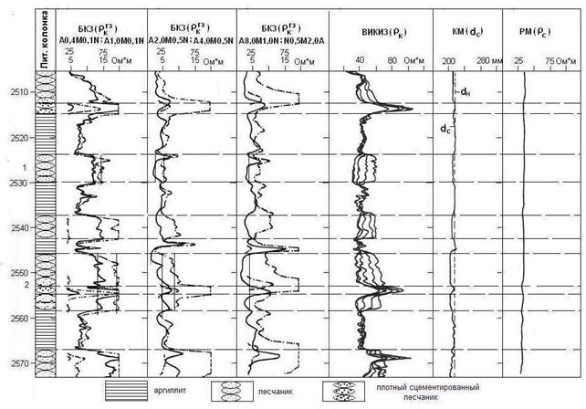 Последовательность операций по качественной и количественной интерпретации данных БКЗ и ВИКИЗ можно показать на примере нефтегазовой скважины, для которой ранее выполнено литологическое расчленение разреза (см. рис. 4.23). Сопоставление кривых БКЗ и ВИКИЗ в этом разрезе приведено на рисунке 4.24.