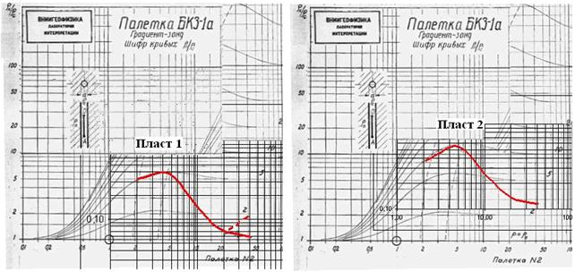 Пласт 1. Наблюдается расхождение фактической кривой с двухслойной палеточной. Правая ветвь сечёт теоретические кривые и уходит вниз, что указывает на повышающее проникновение. Следовательно, пласт проницаемый. По сопоставлению левой ветви с теоретическими оценивалась зона проникновения, которая имеет параметры ρп/ρс = 5, что являляется основой для дальнейшей интерпретации кривой по трёхслойной палетке.