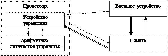 Общая схема организации связей в компьютере (одинарные стрелки – пути и направления передачи управляющих сигналов, двойные – пути и направления движения информации):