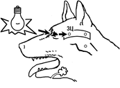 Оказалось, что если, например, включить электрическую лампочку и при этом покормить собаку (рис.), то после 5—10 совпадений света лампочки и пищевого акта только одно действие света вызывает слюноотделение и пищевые движения (рис.).