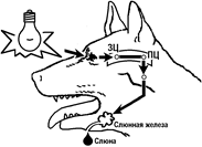 Давно замечено, чтопри виде пищи или при мысли о еде у голодного человека «текут слюнки». И.П.Павлов, наблюдая слюноотделение у собаки не от непосредственного действия пищи на слизистую рта, а только от её вида или от звуков, сопровождающих ее, назвал это явление психическим. Для выяснения механизма психического слюноотделения он сопоставил его с отделением слюны при непосредственном действии пищи на слизистую рта (рис.).