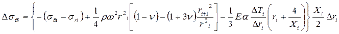 Основой методики расчета являются формулы для определения изменения напряжений в пределах кольца. Начиная расчет с нулевого сечения, где исходные напряжения должны быть заданы, рассчитываем приращение напряжений на всех кольцевых участках, с помощью которых строятся эпюры распределения напряжений σr и σθ вдоль радиуса диска.