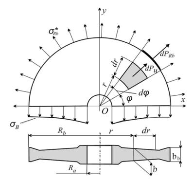 На рисунке 8.13 показана половина диска с приложенными нагрузками. Действие отброшенной половины заменено окружными напряжениями в меридиональном сечении (в момент разрушения равны пределу прочности σв (или σtτ)).