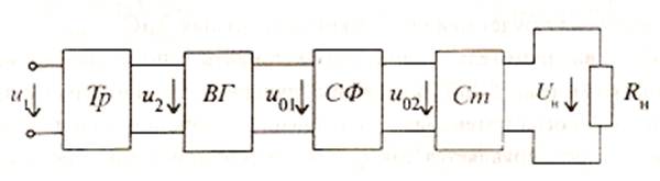 В схеме выпрямительного устройства, рассмотренного на лекции №2 (рис. 3.1) для преобразования переменного напряжения сети в постоянное напряжение рассмотрены трансформатор, выпрямитель и сглаживающий фильтр. Напряжение на нагрузке поддерживается постоянным по значению с помощью стабилизатора Ст. Простейший стабилизатор напряжения – параметрический, в котором используются специальный диод – СТАБИЛИТРОН.
