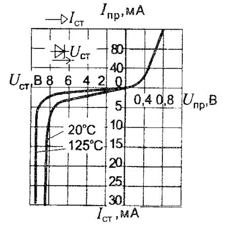 Стабилитрон имеет специфическую вольтамперную характеристику (ВАХ) в обратном включении (рис.3.2). При отрицательном напряжении ВАХ имеет достаточно протяженный участок, на котором напряжение изменяется мало, а ток изменяется значительно.