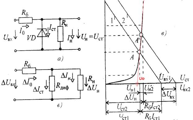в) графическое представление состояния стабилитрона и принципа стабилизации напряжения на нагрузке (Δ U Н<<Δ U вх) при изменении напряжения U вх и большом сопротивлении нагрузки (R Н>> R диф).