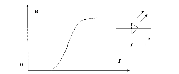 Светодиоды – диоды, создающие некогерентное световое излучение в диапазоне 0.45…0.68мкм. Цвет излучения зависит от типа диода. Излучение создается рекомбинацией инжектированных электронов и дырок. Зависимость яркости излучения B от значения прямого тока I приведена на рис. 3.9. Конструктивная особенность светодиодов – окно с линзой или прозрачный корпус цилиндрической формы с торцевой линзой. Светодиоды используются в виде отдельных или групповых визуальных индикаторов.