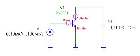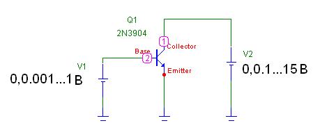 Рис.4.4. demo4_1. Схема для получения входных ВАХ. Аргумент ВАХ – напряжение U Б изменяется в пределах от 0 до 1В с шагом 1мВ, параметр семейства U К изменяется в пределах от 0 до 15В с шагом 0.1В.