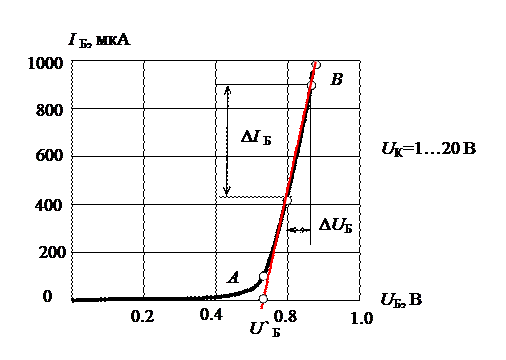 На участке A B можно аппроксимировать входную ВАХ транзистора прямой линией (красная линия на рис.4.6):